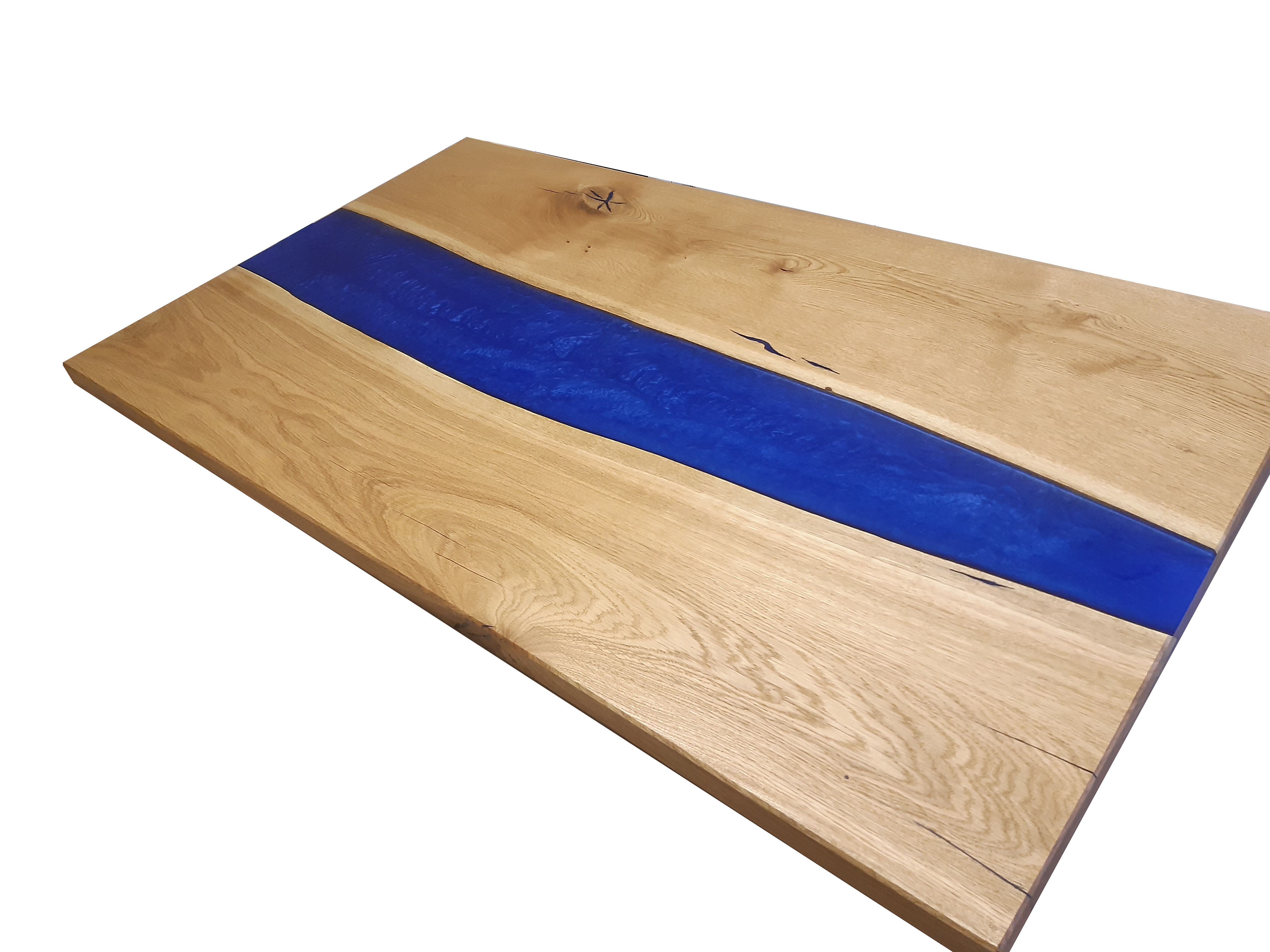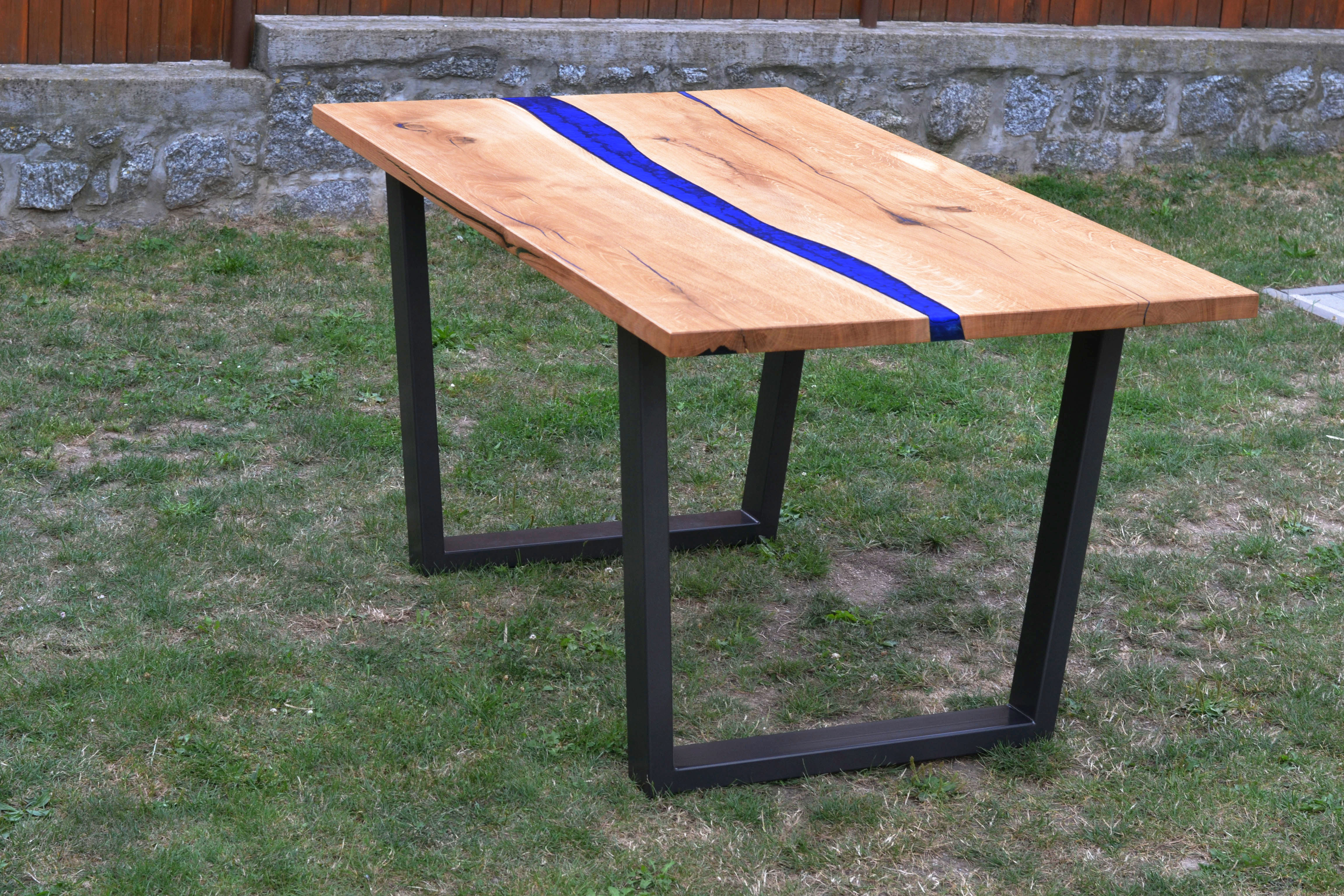 Velký jídelní stůl pro 6 až 8 osob. Dubové fošny vylité tmavě modrou pryskyřicí.